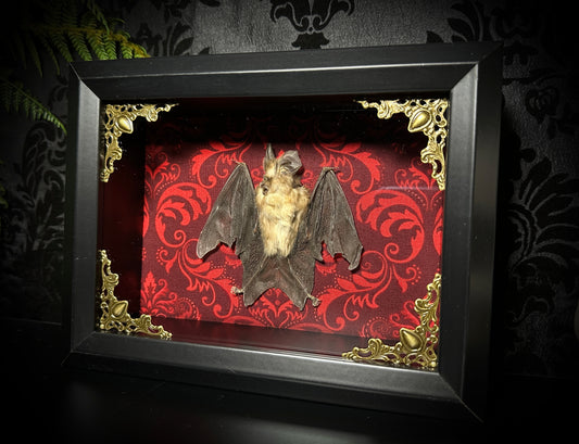 SALE - Taxidermy Horseshoe Bat Shadowbox with Red Damask Backing