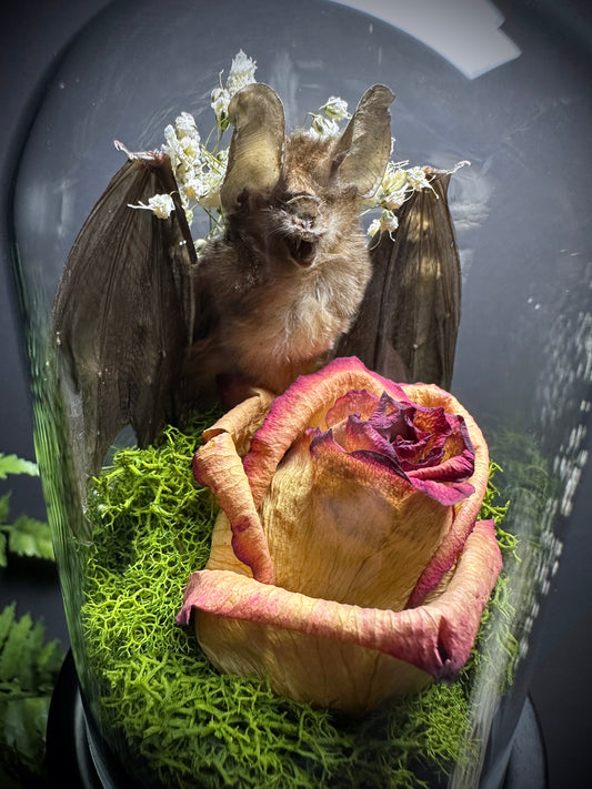 Large Taxidermy Bat & Rose Pedestal Dome Display
