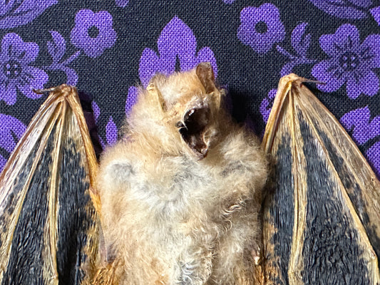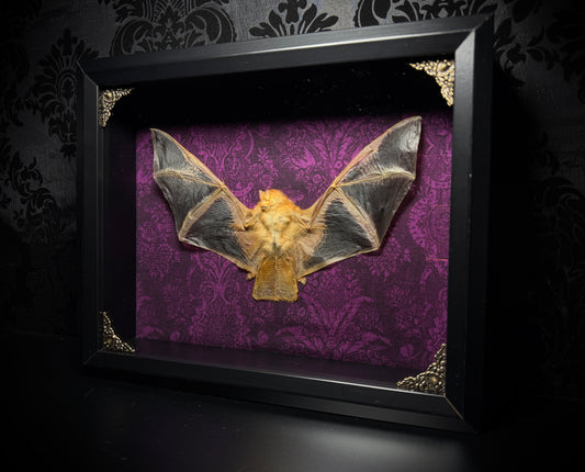 LAST ONE - (DISCONTINUED) Taxidermy Bat Shadowbox with Painted Bat on Purple Damask Backing