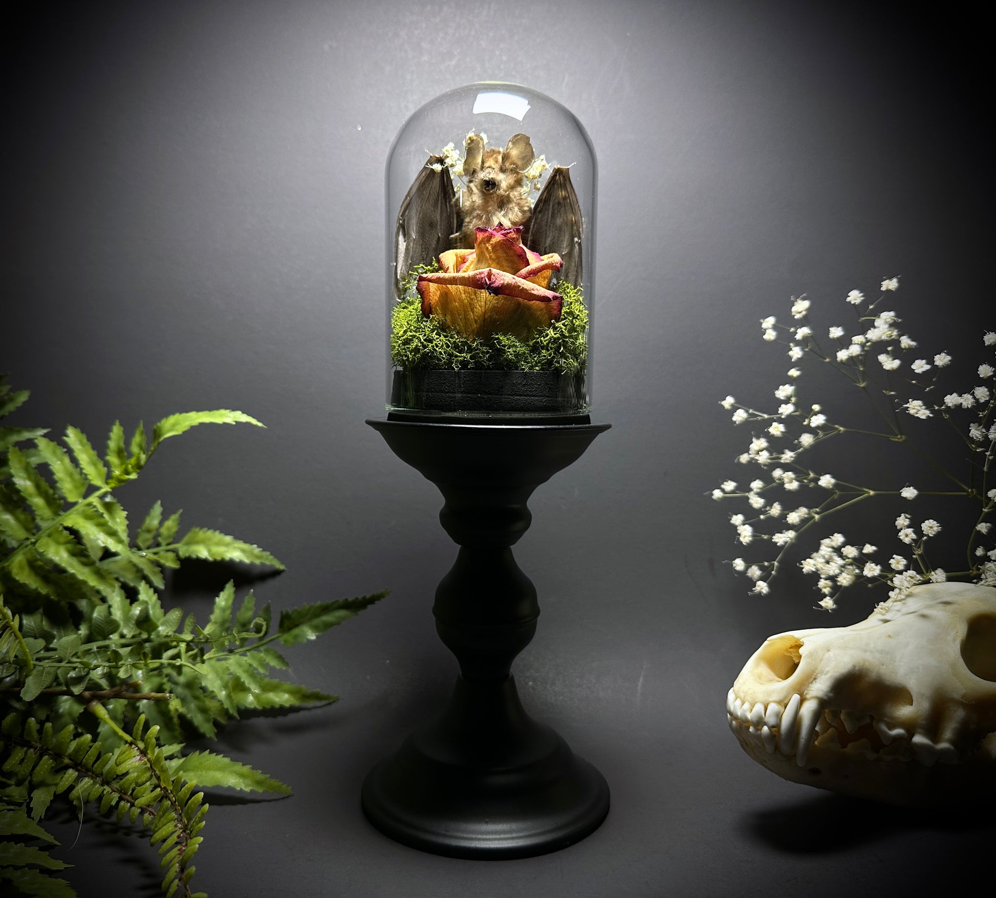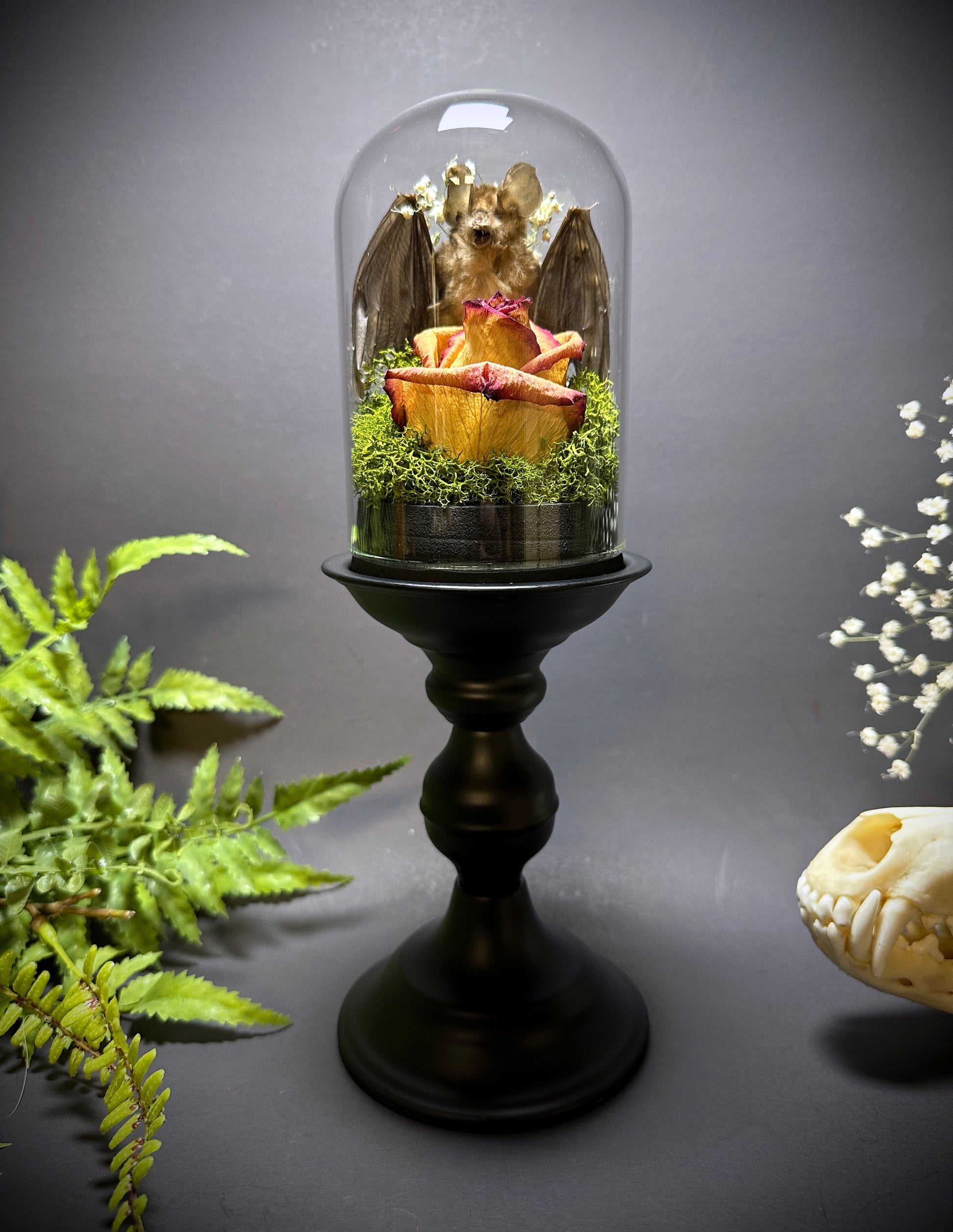 Large taxidermy display features a real horseshoe bat inside a glass dome cloche with a real dried 2-tone rose and green moss with accent flowers. The base is made of a hollow metal and has a matte black finish.