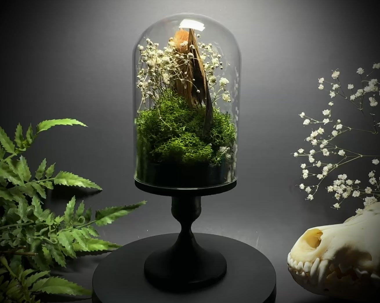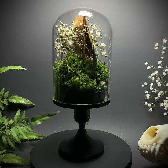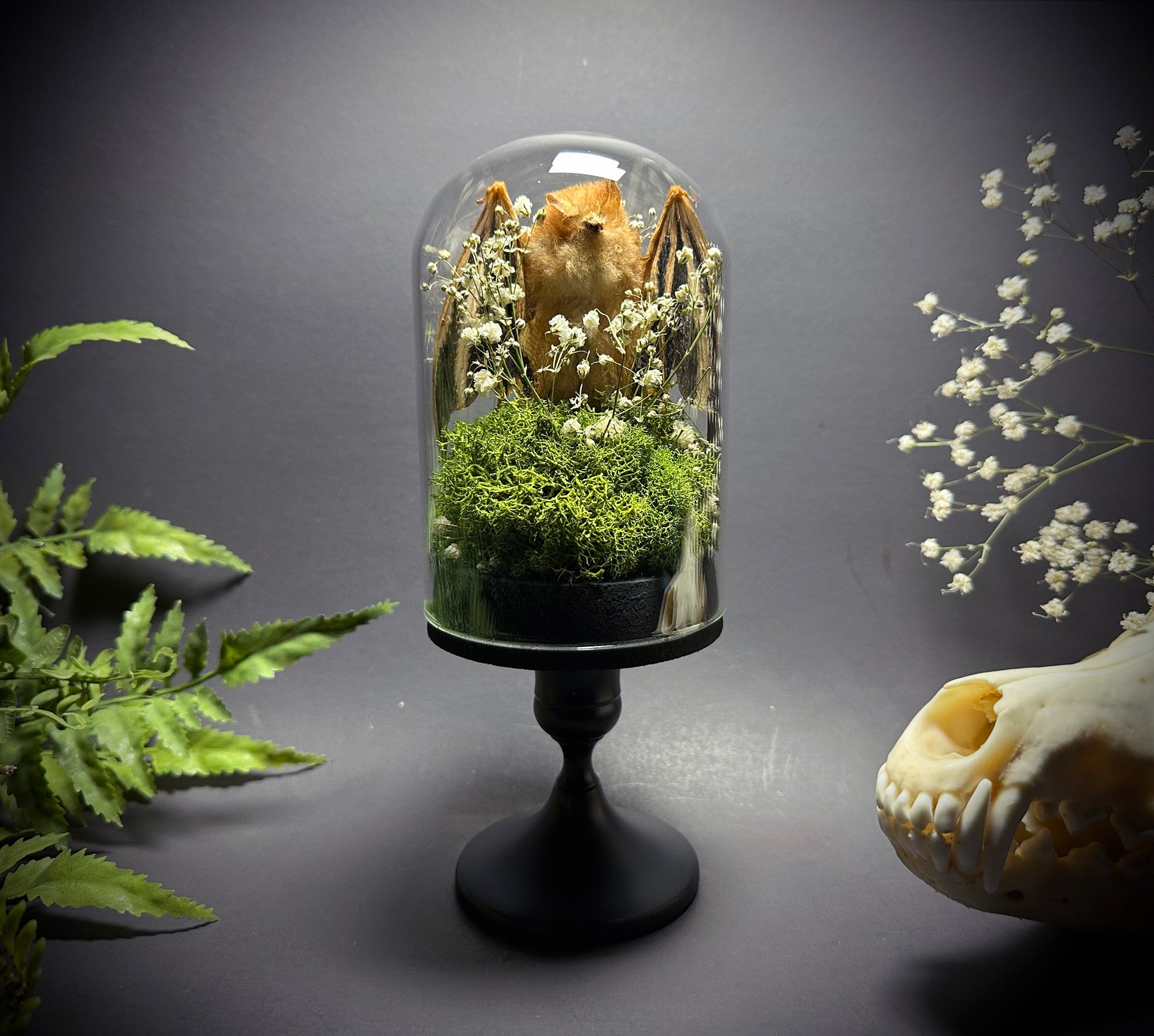 This brightly colored little fellow is the Painted Wooly Bat. He comes to you with his wings folded inside a class cloche dome on a black pedestal base, surrounded by bright green moss and small white flowers.