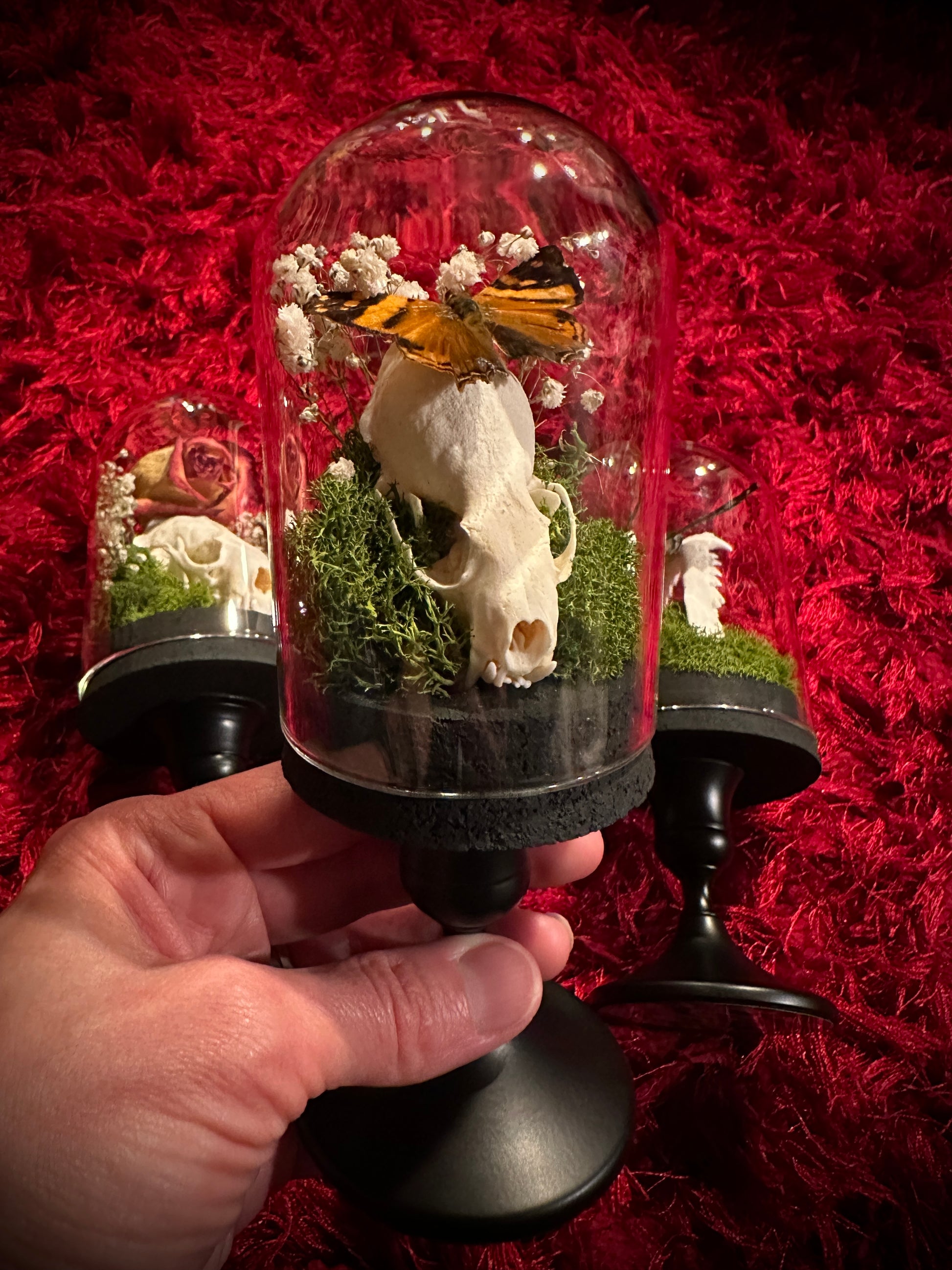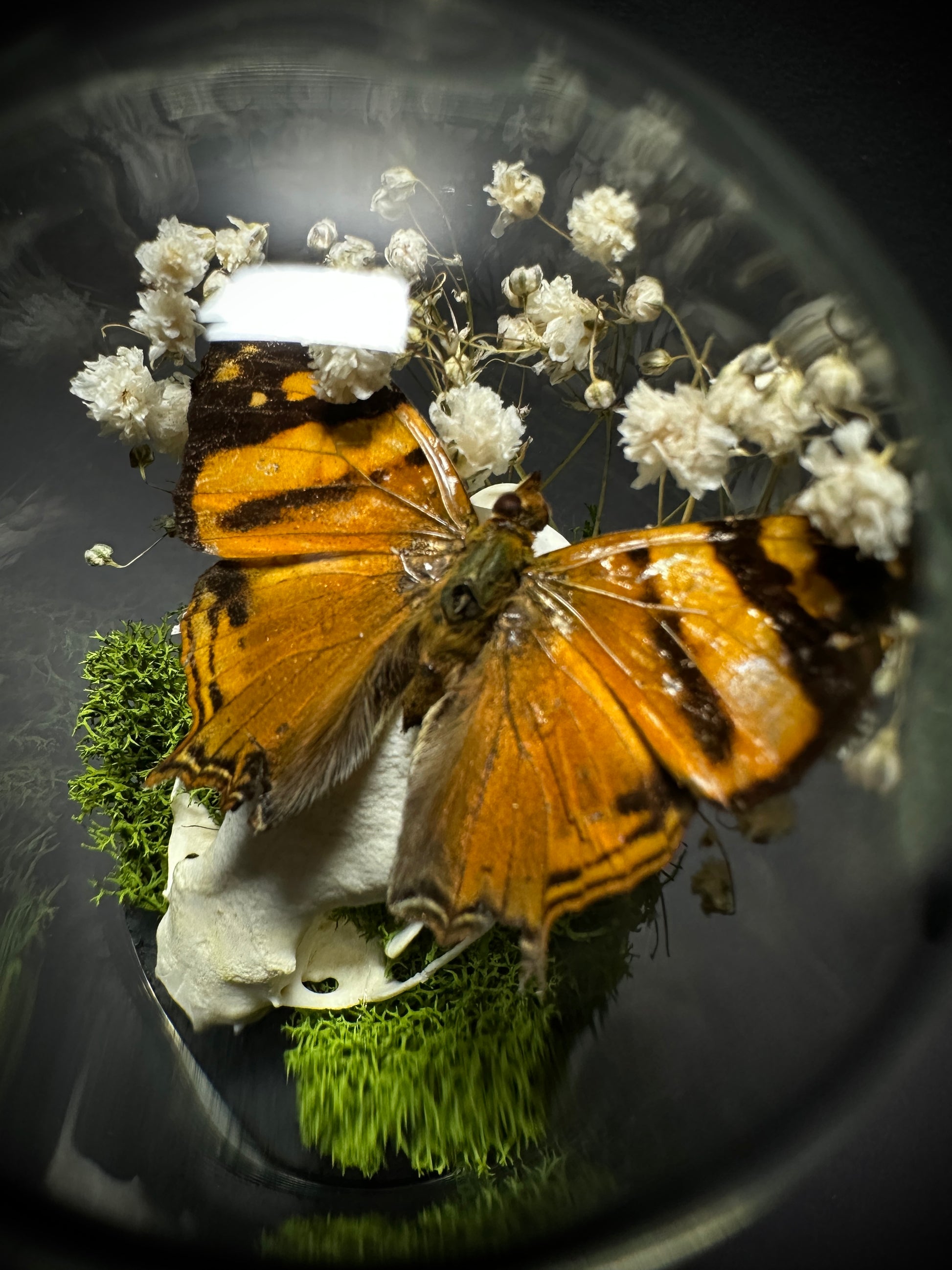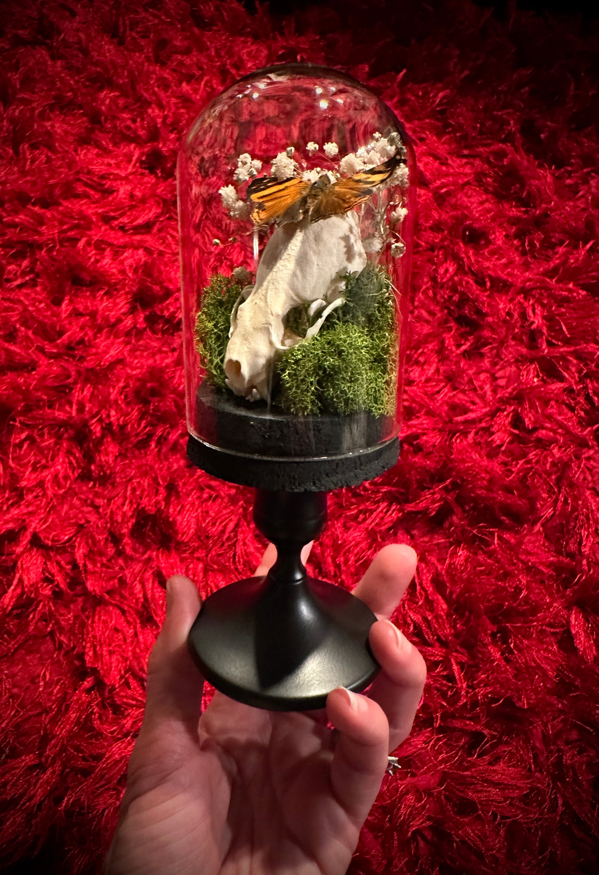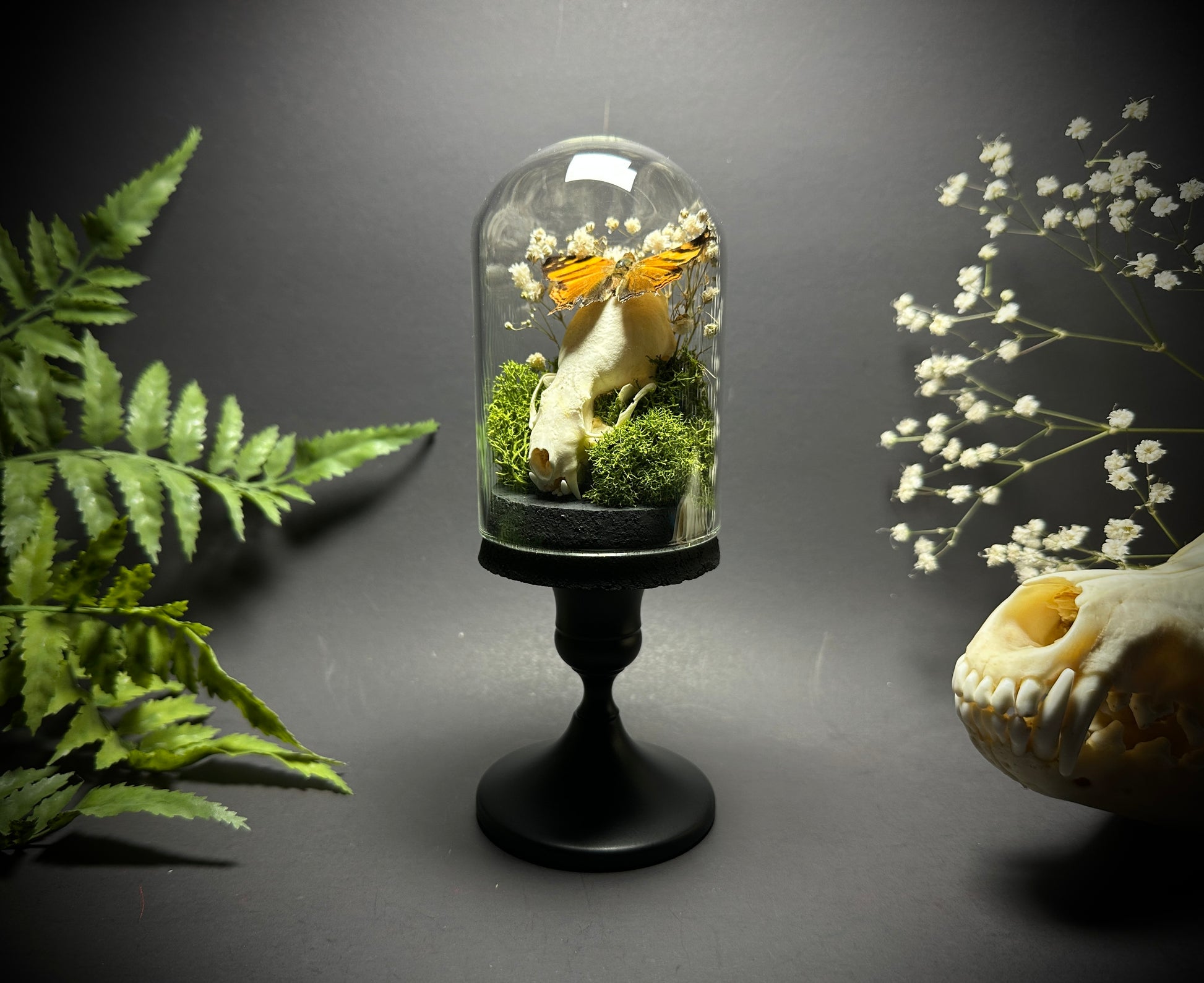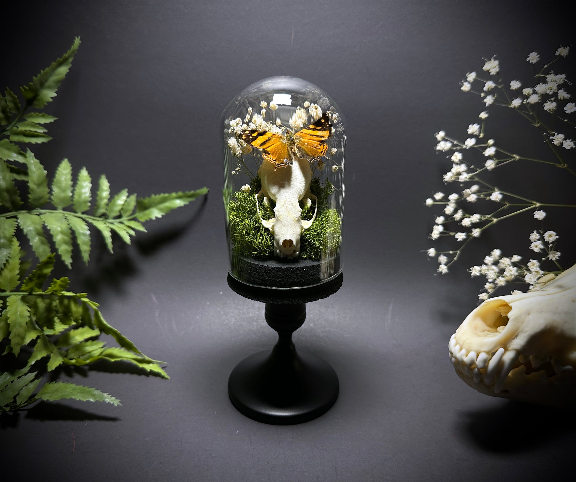 Both beautiful and somewhat sinister... this taxidermy display features a real small mink skull inside a glass cloche dome pedestal display. Atop the jawbone rests a gorgeous Hypanartia Lethe butterfly with it's wings spread for flight. This butterfly has beautiful orange and black markings on the wings. There is a small amount of scale loss in the wings, but it's still an absolutely gorgeous specimen with very vibrant coloring. Antennae were compromised prior to mounting, so they have been removed. Surrounding the butterfly and skull is dried baby's breath and green moss, which really makes the orange in the butterfly POP. Note- this dome is slightly smaller than my other domes... My hand is shown in many of the photos so you can get a more accurate idea of size - It is roughly the size of my hand (7 inches tall).