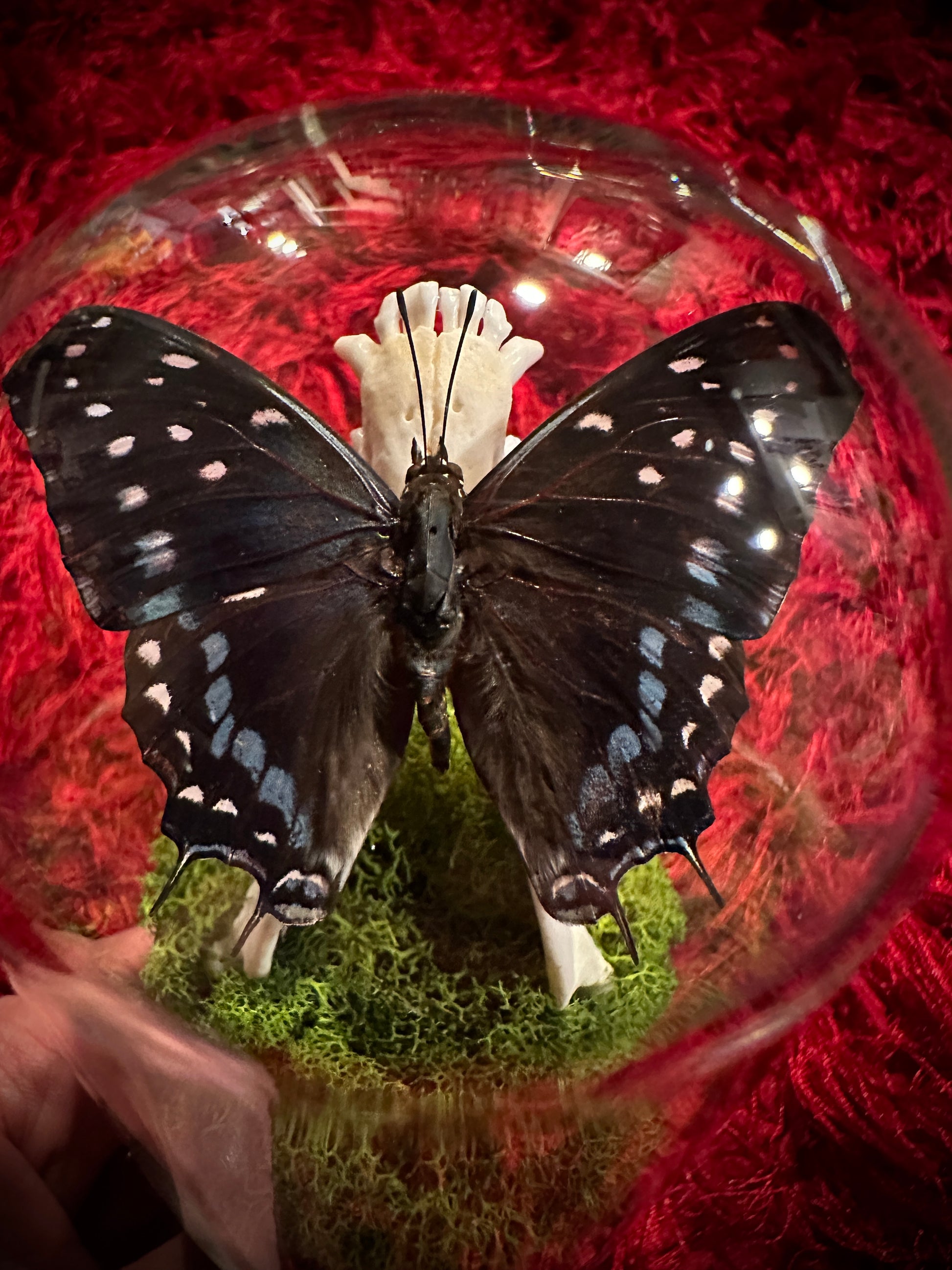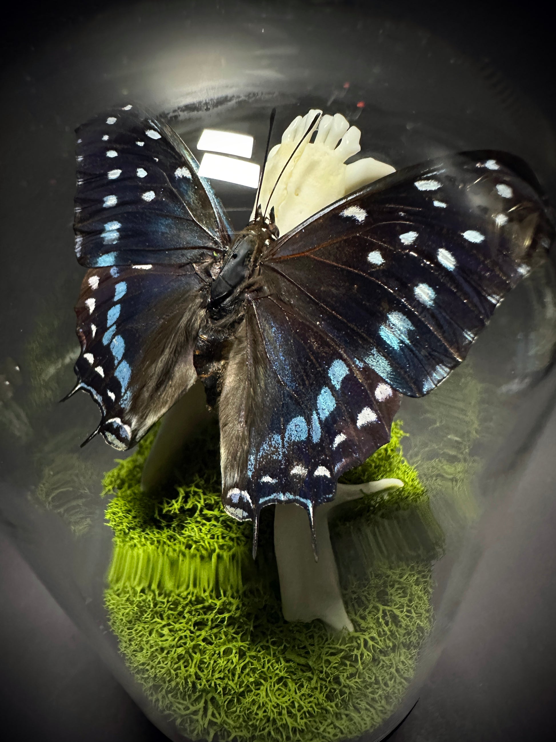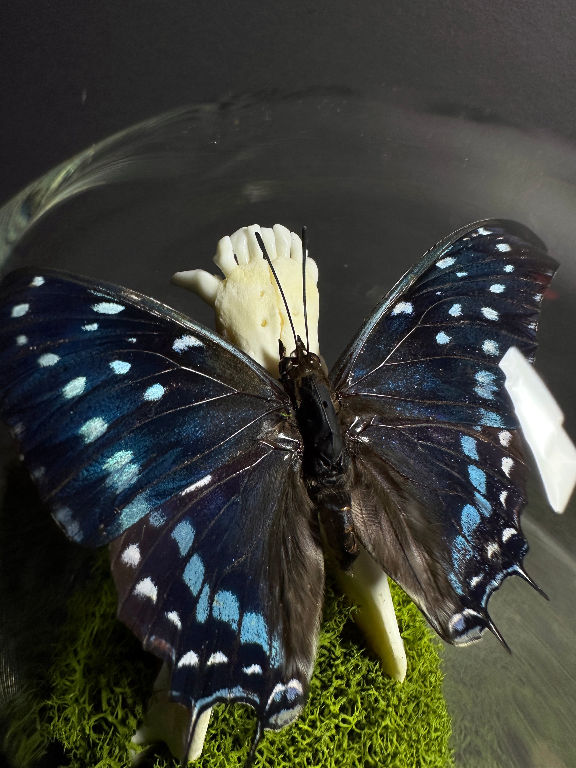 Both beautiful and somewhat sinister... this taxidermy display features a real raccoon jawbone inside a glass cloche dome pedestal display. Atop the jawbone rests a gorgeous Charaxes Etesipe butterfly with it's wings spread for flight. This butterfly has beautiful blue and black coloring with white speckles on the wings-- an absolutely gorgeous specimen!