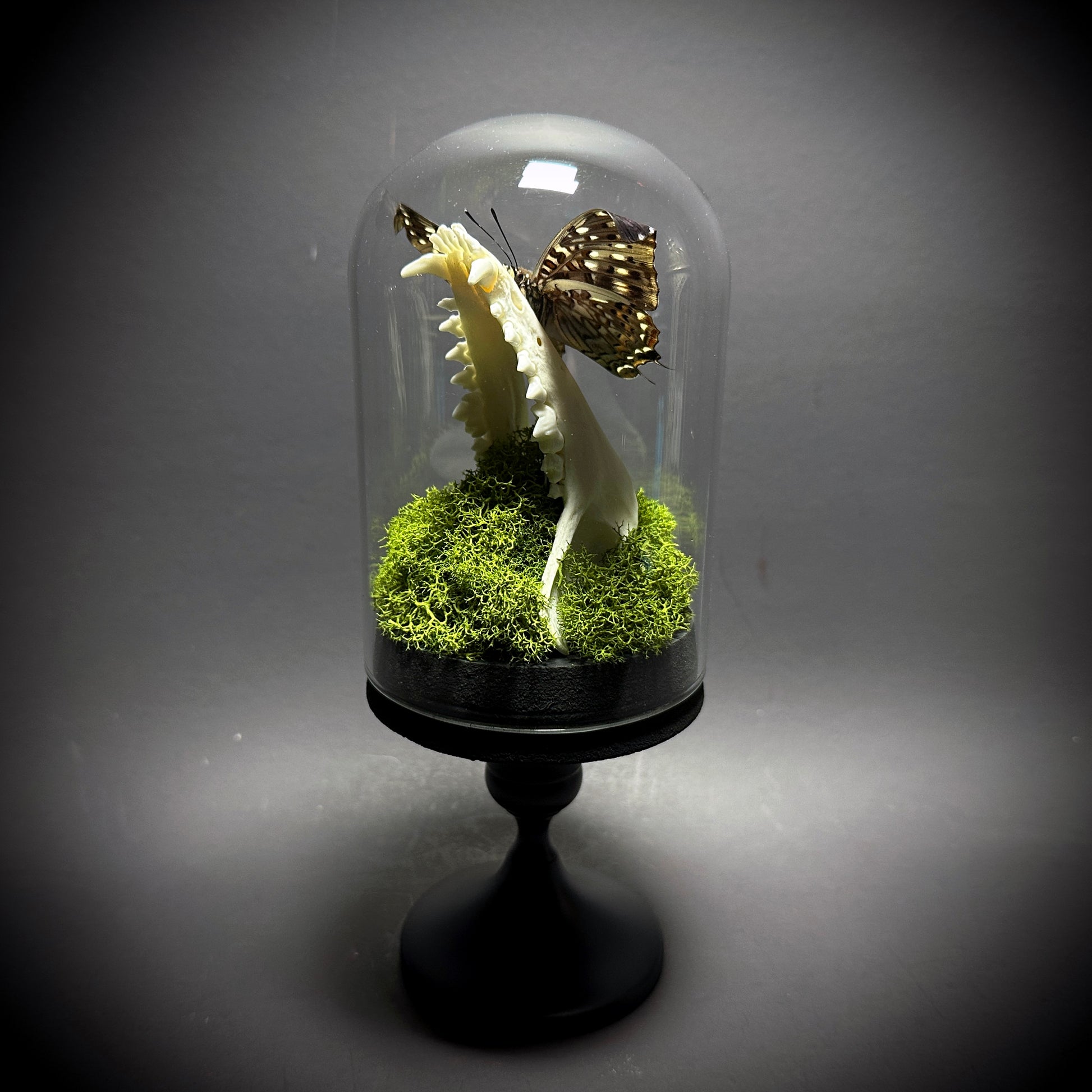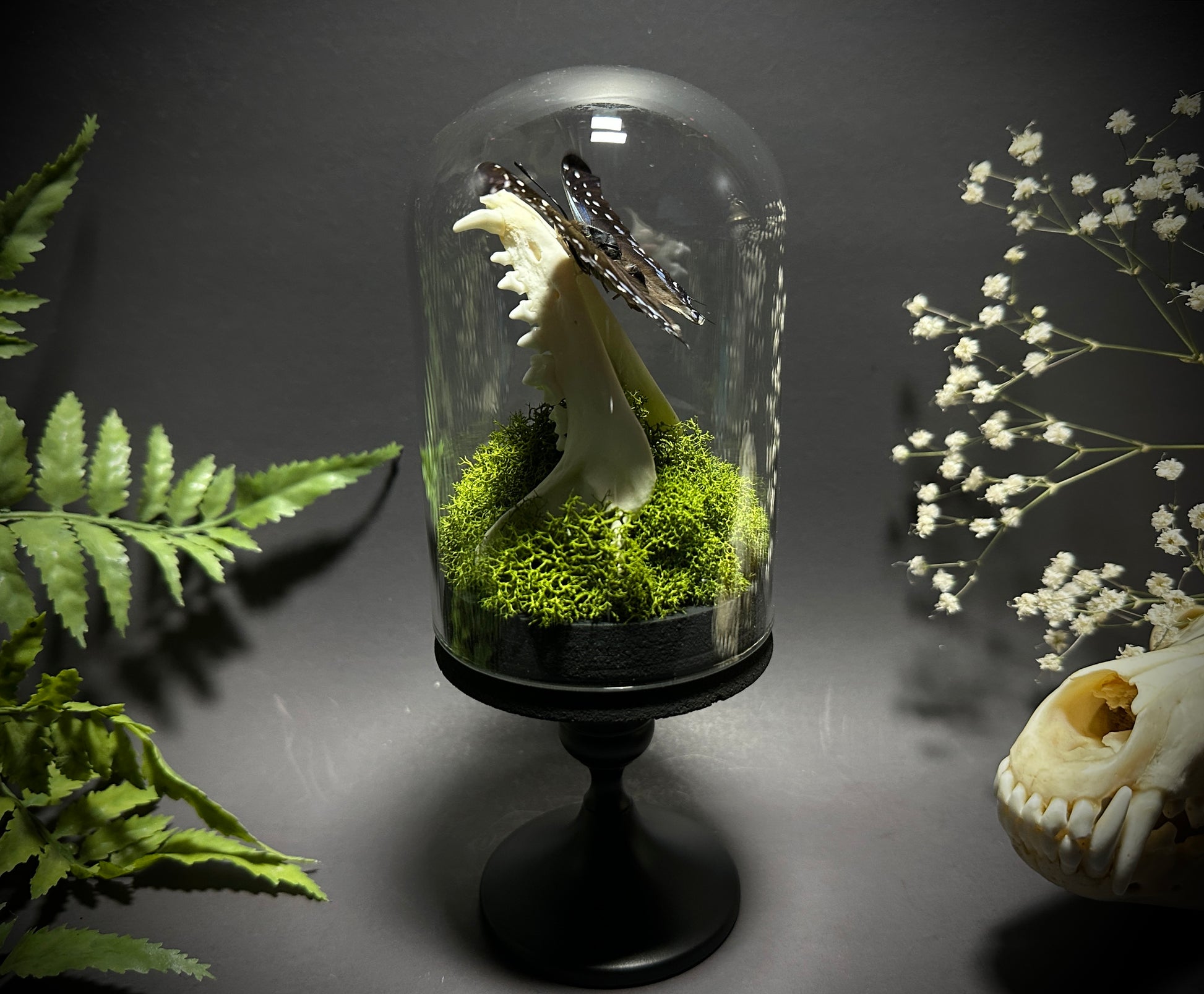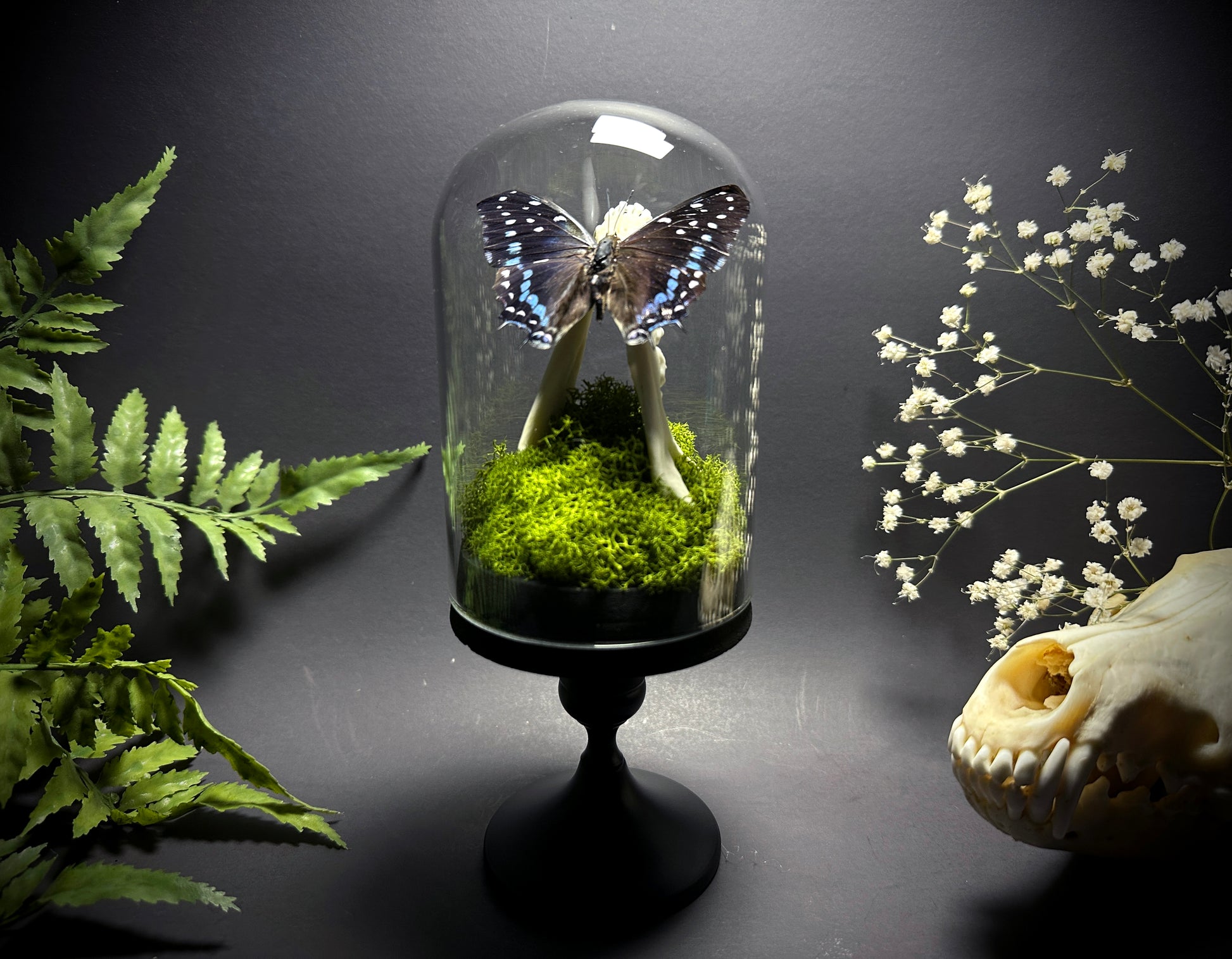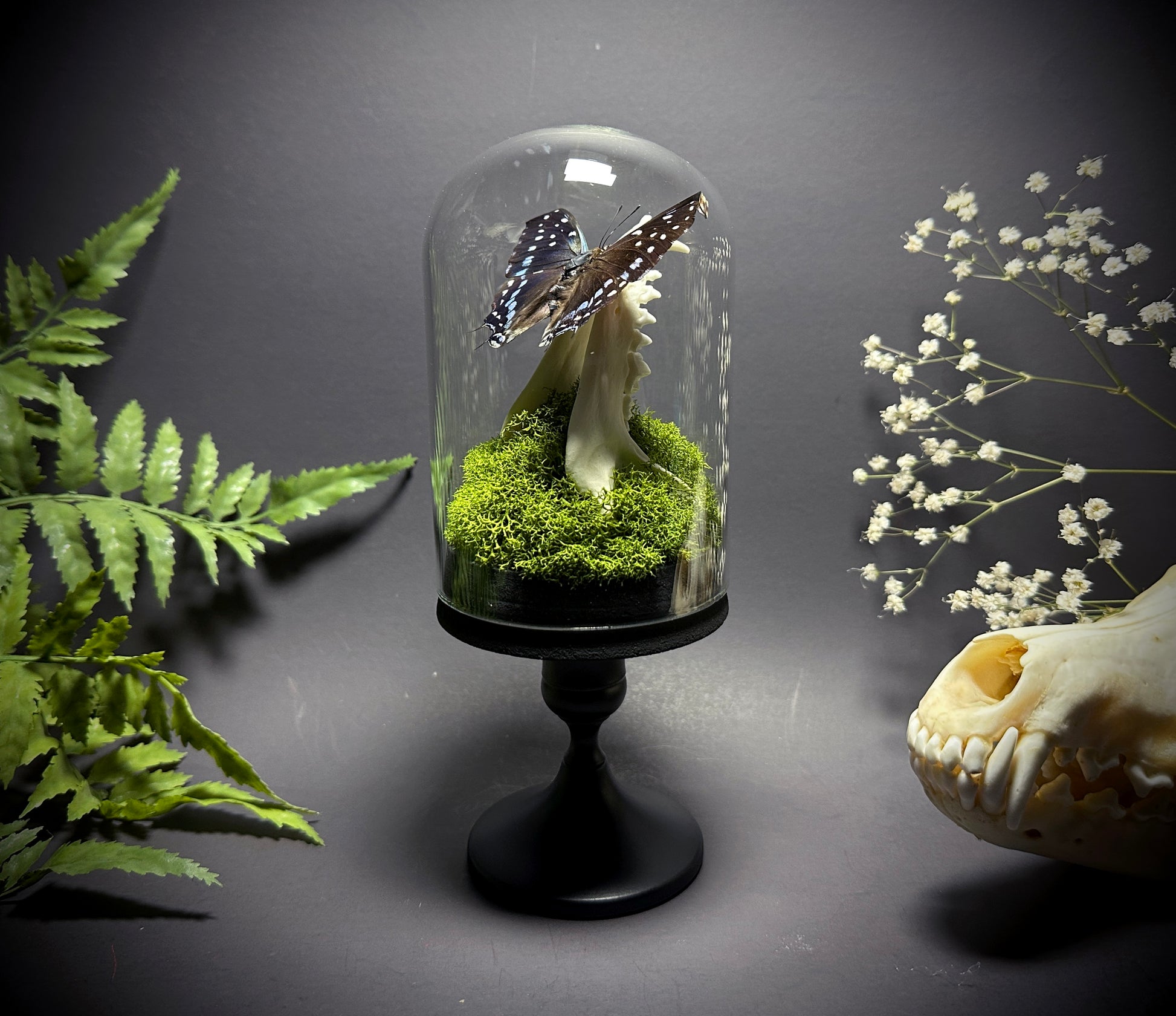 Taxidermy Dome Pedestal Display - Raccoon Jawbone with Blue & Black Butterfly